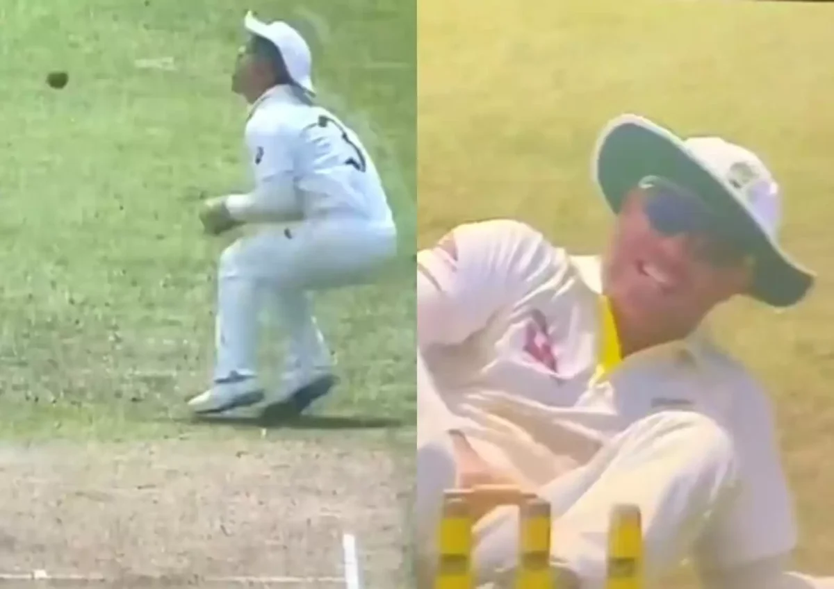 In the clip, one can see how Warner was entirely focused on taking the catch and didn’t have any idea that one of the bails adjoining the three stumps is about to hit him where it hurts the most.
