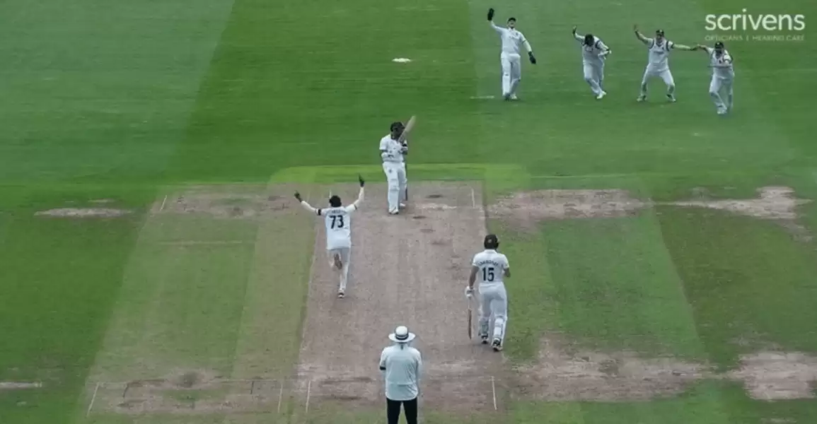 The pacer got the ball to rise off the good length area and moved it ever so slightly to induce an outside edge that comfortably landed into the hands of the Warwickshire wicketkeeper Michael Burgess.