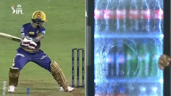 It happened in the 13th over of the innings. Umran steamed in and delivered a pacy short of a length delivery. Rana backed away and played a fierce cut shot using the pace of the bowler. He had timed the ball well as it flew away past the boundary and ended up hitting the fridge near the SRH dugout to break its glass.