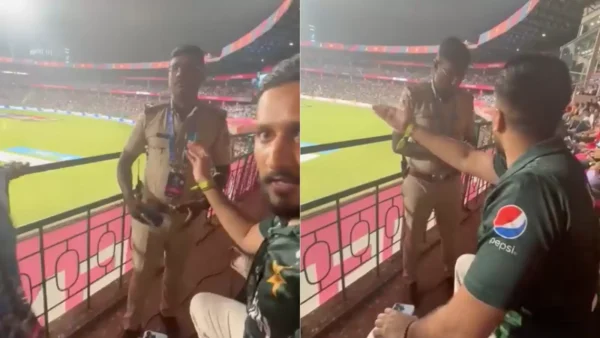 In the video clip, a cricket enthusiast at the M Chinnaswamy Stadium, donned in a Pakistan cricket team jersey can be observed engaging in a discussion with a police officer regarding his ability to cheer for his team. In response, the officer asserted that proclaiming ‘Bharat Mata Ki Jai’ is acceptable, while exclaiming ‘Pakistan Zindabad’ is not deemed appropriate.