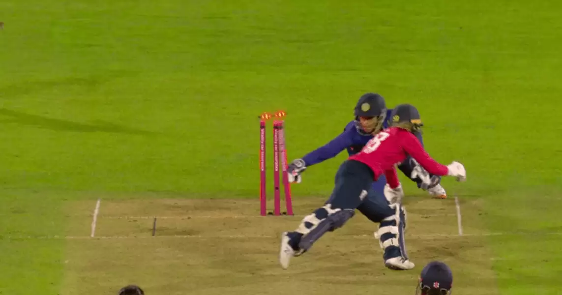 Rana spotted Wyatt’s attempted big hit early and sent one down the leg-side. Even though it was set to be a wide, Rana didn’t want to miss the opportunity to get the dangerous batter out with the help of her keeping partner.