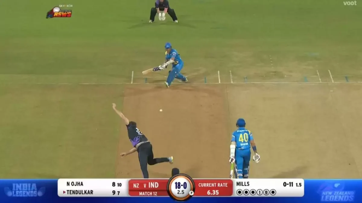 Facing a straight ball aimed for the stumps by New Zealand Legends speedster Shane Bond, Sachin Tendulkar went back and across to his right, created space for himself to get underneath the ball perfectly before unleashing a perfect scoop shot.