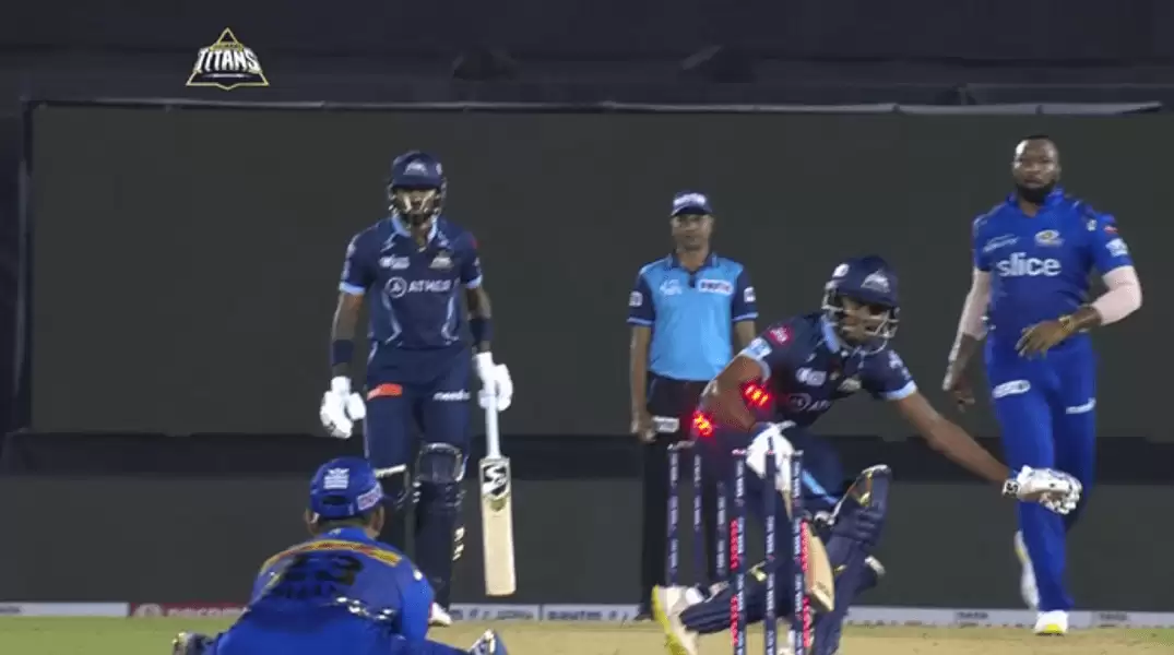 Deceived by a slower ball from Mumbai Indians (MI) allrounder Kieron Pollard, Gujarat Titans (GT) batter Sai Sudharsan got out hit-wicket in the IPL 2022 league stage encounter played on Friday (May 6).
