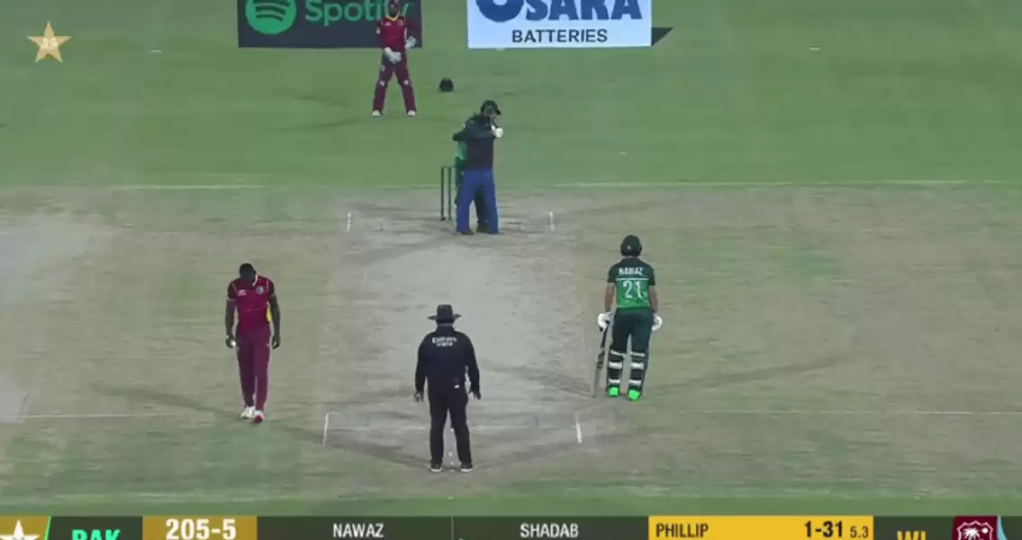The incident took place halfway through the 39th over in Pakistan’s first-innings. About to face West Indies pacer Anderson Phillip, Shadab Khan was left puzzled briefly as to why the seamer has halted his run-up, before the batter saw a man running onto the deck towards him.