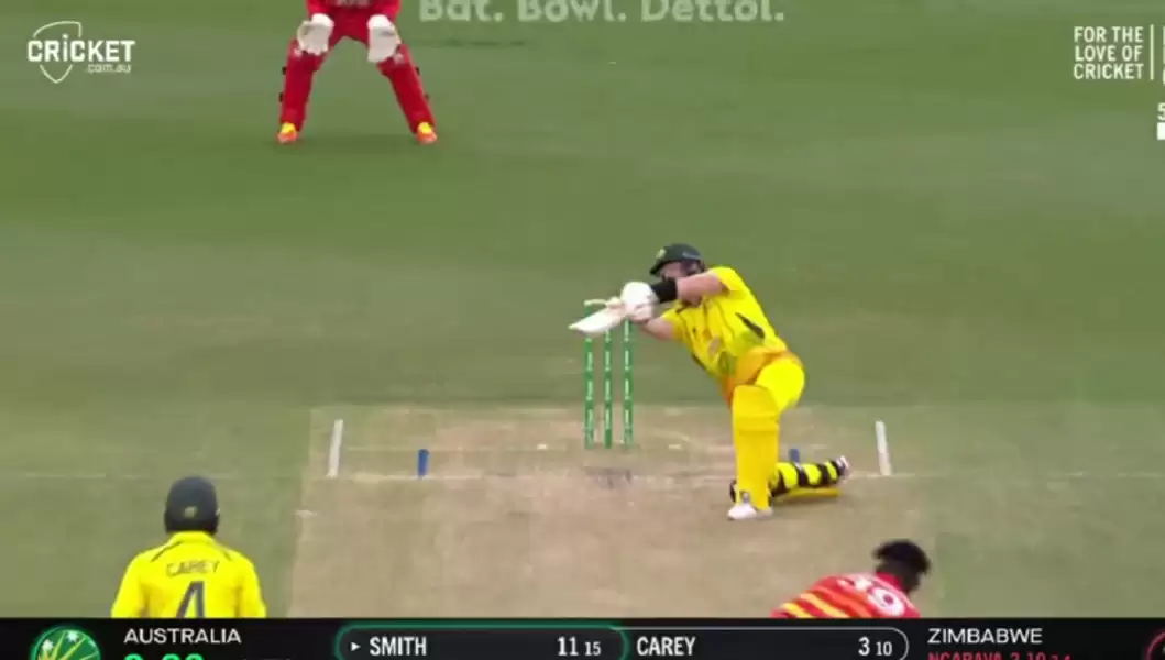 The six was witnessed near the close of the seventh over in the Australian run-chase. Facing Ngarava from the over-the-wicket angle across the right-hander, Steve Smith tried to take on the left-arm quick by dancing down the track.