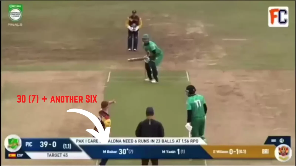 In the first over of the chase, the Badalona scored 38 runs. While four of those came off leg byes, bowler Jack Hall bowled three no-balls and a wide. Babar scored 30 of the runs off seven balls. One of the no-balls Hall bowled went for a colossal six out of the park.