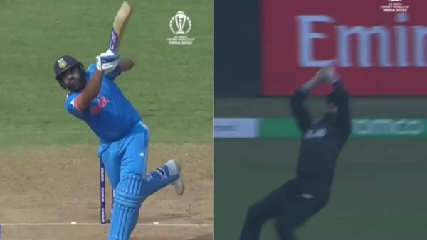 Kane Williamson executed a remarkable catch while moving backward to dismiss Rohit Sharma, who was scoring aggressively in the ongoing 2023 ODI World Cup first semi-final between India and New Zealand at the Wankhede Stadium. Tim Southee delivered a slower ball, enticing Rohit into a powerful shot directed towards the mid-off region. Failing to time the ball correctly, it soared high in the air and Williamson skillfully secured the catch.
