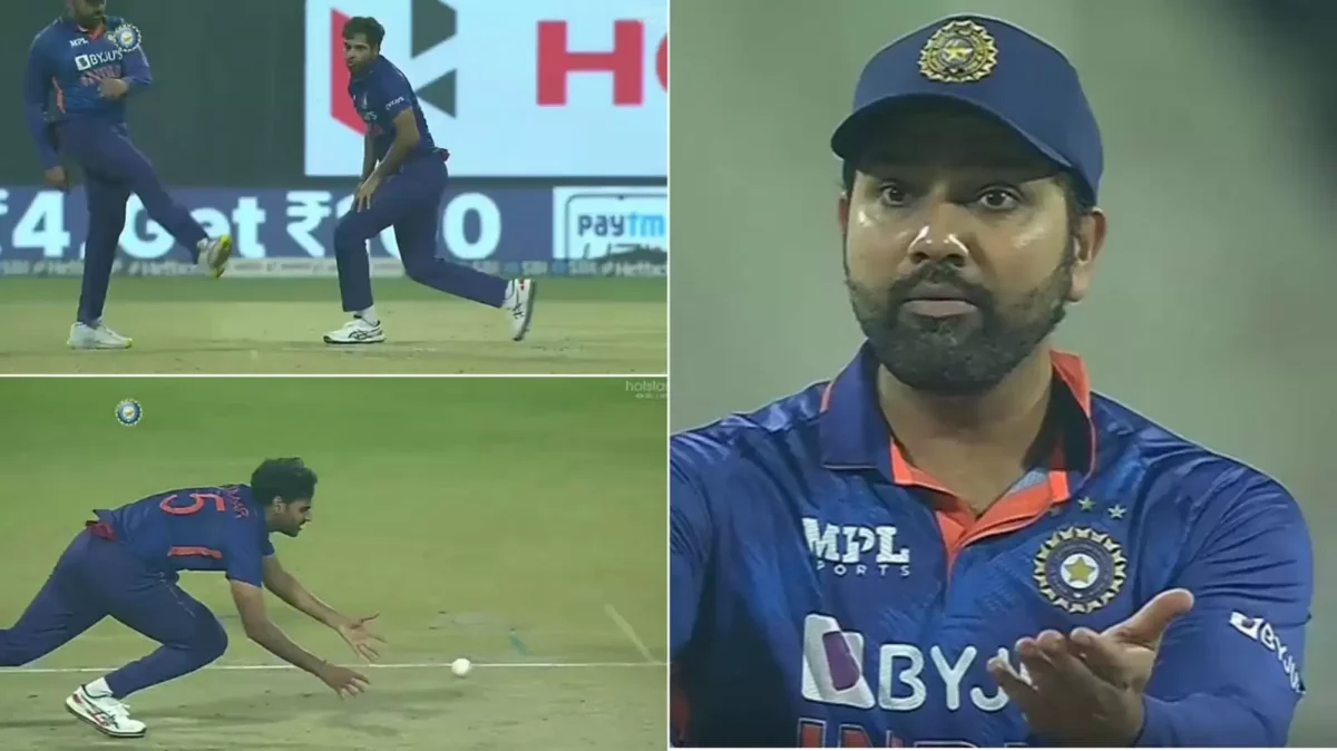 Indian skipper Rohit Sharma wasn’t particularly happy with Bhuvneshwar Kumar after the latter dropped a catch during the second T20I against the West Indies on Friday at the Eden Gardens in Kolkata. In the 16th over of the Caribbean team’s innings, Kumar grassed a simple catch, giving Rovman Powell a much-needed lifeline.